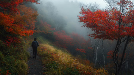A lone hiker exploring the misty autumn trails near Tsuta Onsen, with fiery red and orange trees framing the path in Aomoriaes countryside.