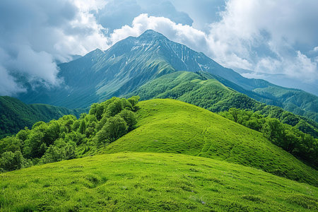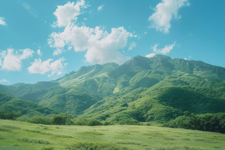 A breathtaking view of a majestic mountain meadow under a bright blue sky with fluffy clouds and lush green vegetation.