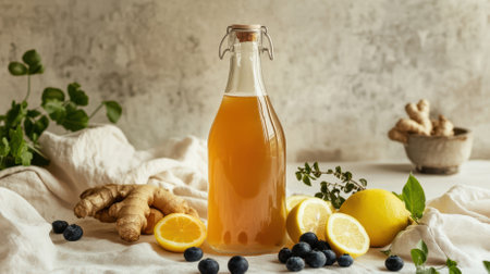 Glass swing top bottle filled with healthy fermented kombucha tea, surrounded by fresh ginger, lemon, and blueberries, lies on a white tablecloth, creating a vibrant scene