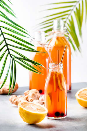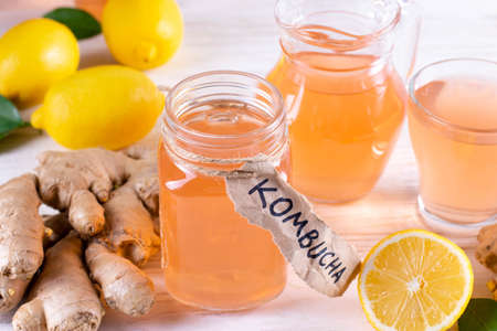 Fermented Raw Kombucha Healthy Drink With Raw Ginger And Lemon.Tea Ready to Drink