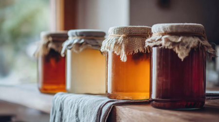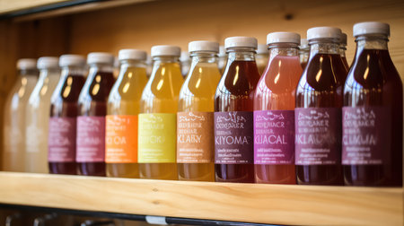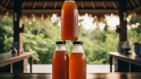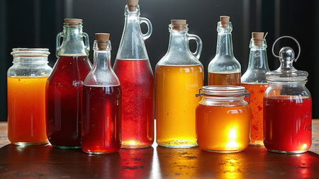 Assorted colorful bottles of fermented tea in glass containers with cork lids on wooden table. That the image is generated using AI.