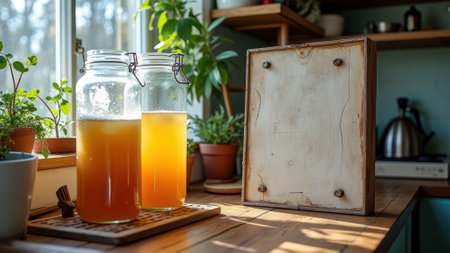 Sunlit kitchen with homemade fermented tea in glass jars and potted plants. That the image is generated using AI.