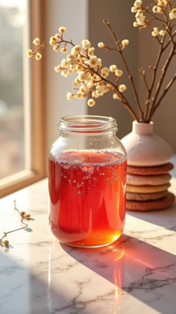 Sunlit jar of amber liquid on marble surface with dried flowers in the background. That the image is generated using AI.