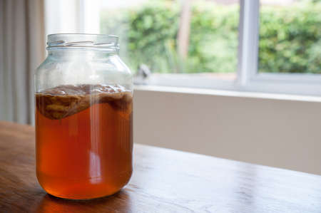 Homemade kombucha fermenting in a glass jar on a wooden table near a window with visible scoby and carbonation bubbles.