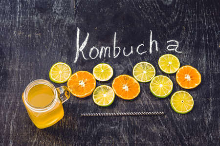 Homemade Fermented Raw Kombucha Tea Ready to Drink With orange and lime. Summer.