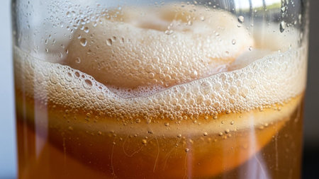 A bubbly, frothy layer of fermentation sits atop amber liquid in a glass jar, showing the beginning of a SCOBY.