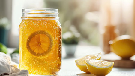 Close-up of a mason jar filled with honey lemon juice, with lemon wedges on a white caf table.
