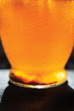 Ginger beer in tumbler glass on white oak table wuth sunlight
