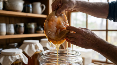 Hands lifting wet SCOBY sheet from fermentation container, kombucha leather production, sustainable biomaterial harvesting. Focus on scoby. Image created using generative AI.