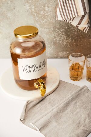 close up view of jar with kombucha on grey napkin