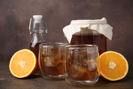 Tasty kombucha with ice cubes and orange on wooden table