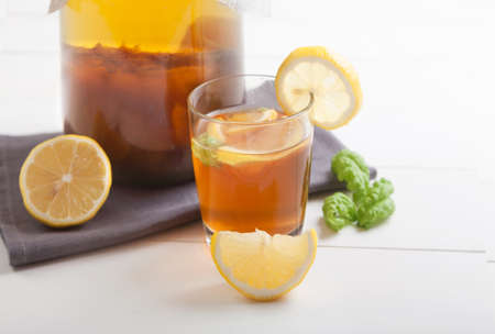 Raw fermented homemade alcoholic or non alcogolic kombucha superfood. Ice tea with healthy natural probiotic in glass with lemon slice on wooden background