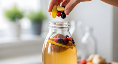 A close-up of a hand adding fresh ingredients, including sliced ginger, cranberries, and other berries, to a glass bottle of kombucha. This image depicts the second fermentation process of making homemade kombucha, highlighting a healthy, probiotic-rich drink.