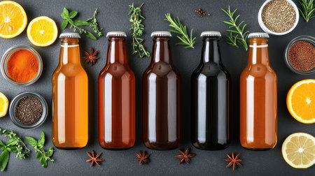 Five bottles of colorful beverages arranged on a dark surface, surrounded by fruits, herbs, and spices for a refreshing drink experience.