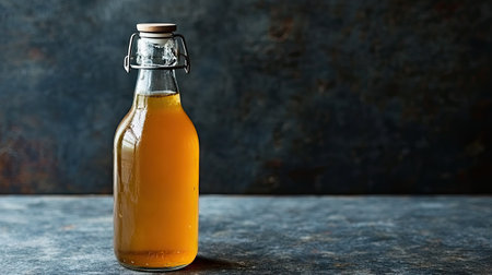 A bottle of kombucha against a plain background with free place for text. Trendy organic refreshing natural beverage