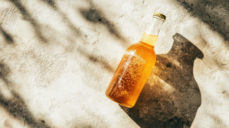 This artistic image captures a glass bottle filled with amber liquid, showcasing its elegant shadow on a textured surface under gentle sunlight, evoking warmth and relaxation.