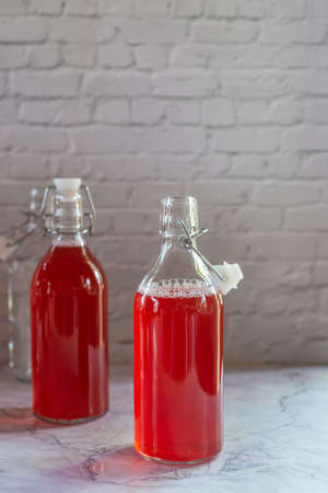 homebrew rose Kombucha in swing top glass bottle on white table background., fermented tea drink, healthy beverage.