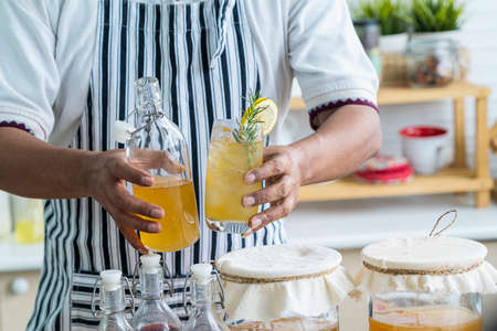 Kombucha tea with lemon on hand. Kombucha superfood probiotic beverage in glass. Kombucha mushroom pro biotic in unrecognizable man hand.