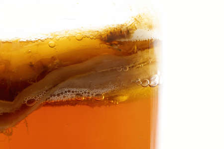 Close-up view of a transparent container filled with layered colorful liquids, showcasing distinct bands of orange, yellow, and brown, with visible bubbles and textures throughout the liquid layers