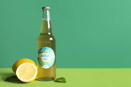 Bottle of tasty kombucha tea with lemon and mint on green background