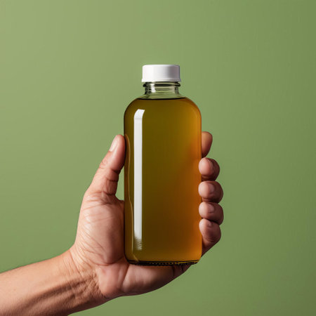 an elderly hand carefully grasps a glass bottle of kombucha, adorned with a blank white label, set against a serene green background, showcasing a high-detailed, ready-made mockup perfect for branding and packaging design, health food, and beverage marketing projects. ai generated