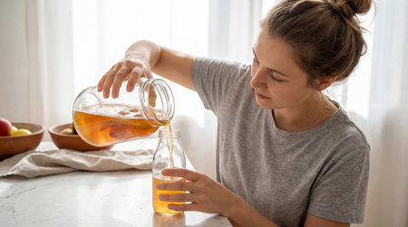 Young woman in gray t shirt pouring homemade kombucha from glass jar into reusable bottle on bright kitchen counter.