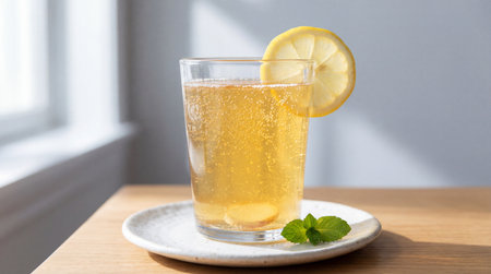 Sparkling ginger lemon drink in clear glass on wooden table with fresh mint garnish in bright natural light by window.