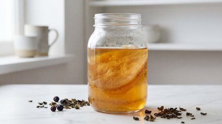 Fermenting kombucha tea in glass jar with scoby on white kitchen counter surrounded by loose tea leaves and berries in natural light.