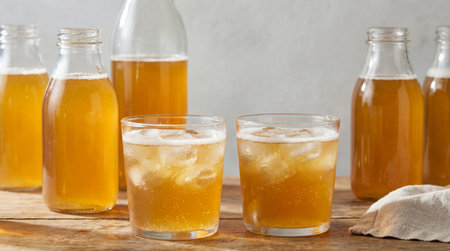 Chilled golden fermented drink in glass cups with ice on rustic wooden table surrounded by clear bottles in soft natural light.