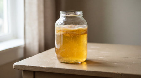 Fermenting kombucha tea with floating scoby culture in glass jar near window, healthy homemade probiotic drink brewing in natural light.