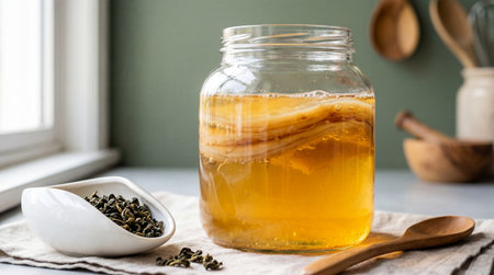 Golden kombucha tea fermenting in glass jar with healthy scoby culture beside loose tea leaves on kitchen table near window light.