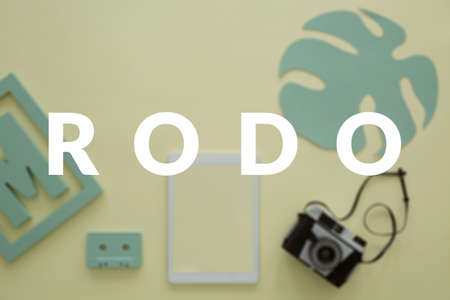 Monstera leaf, vintage camera and yellow tablet on a blurred desk of a blogger. RODO implementation in a small, creative business concept