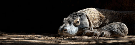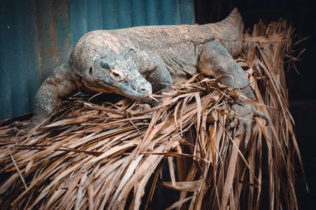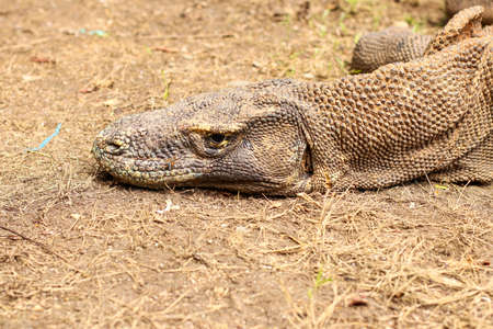 Close up portrait of Komodo Dragon lying anf resting. Varanus komodoensis also known as the Komodo monitor, is a large species of lizard found in the Indonesian islands of Komodo, selective focus, copy space.