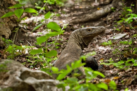 A huge Komodo dragon (Varanus komodoensis) at ground looking around. This lizard is a large monitor from Indonesian islands
