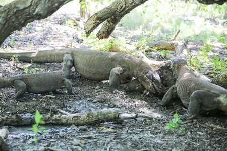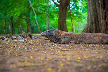 Comodo dragons walking in a park among trees. Indonesia, Rinca island