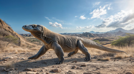 A breathtaking shot of a Komodo Dragon his natural habitat, showing his majestic beauty and strength.