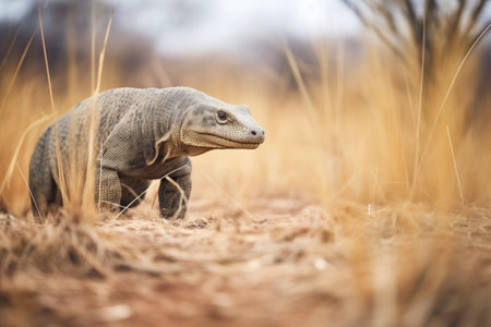 hungry monitor lizard hunting in sparse shrubland