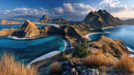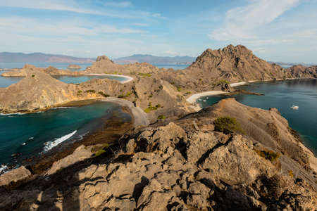 Panoramic warm view at top of Padar Island in sunrise late morning from Komodo Island, Komodo National Park, Labuan Bajo, Flores, Indonesia