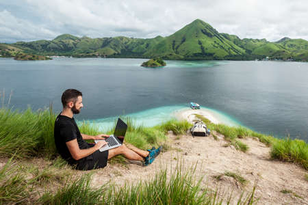 A traveller sitting on top of Padar island and talking picture of beautiful landscape at sunset, Flores island in Komodo national park, Indonesia, Asia