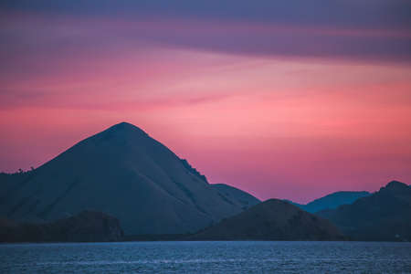 Sunset sky, mountains, ocean. Landscape. Komodo, Indonesia. Stunning colorful sunset over the mountains and Pacific ocean. Komodo National Park, Indonesia. Splash of purple, violet, blue and colors.