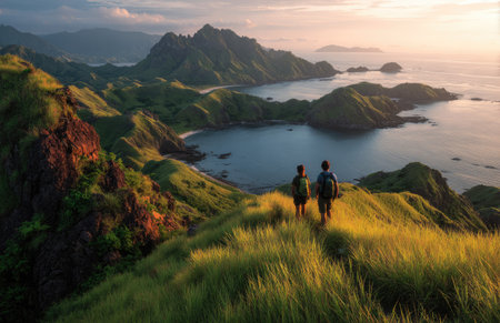 Two individuals stand on a grassy ridge, gazing at a breathtaking coastal vista. The scene features lush green hills, a tranquil bay, and a range of mountains fading into the distance. The warm sunlight bathes the landscape, suggesting an outdoor adventure suitable for travel or editorial purposes.
