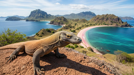 Komodo island in Indonesia, where dramatic volcanic terrain and crystal-clear beaches merge with unique wildlife to spark an adventurous journey into nature.