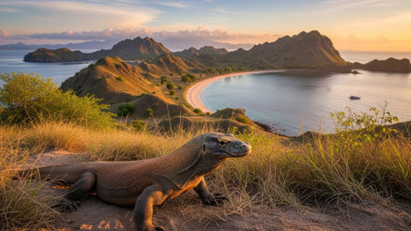 Komodo Dragon at sunset, Komodo National Park, Indonesia