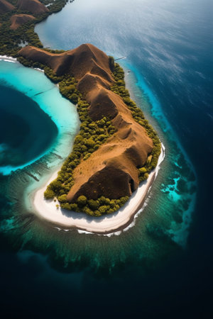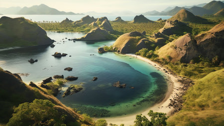 Generative AI : Aerial view of a black sandy shoreline on Komodo Island Komodo National Park Indonesia