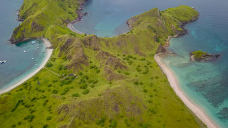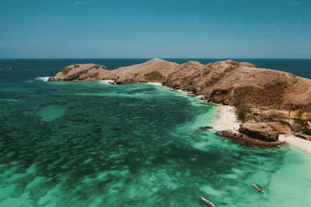 A drone shot of two bigger paradise islands in Komodo National Park, Flores, Indonesia. The islands have scarcely any trees and bushes. Dry land. Idyllic white sand beaches. Island hoping