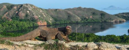 Komodo dragon, scientific name: Varanus komodoensis. Scenic view on the background, Natural habitat. Indonesia.