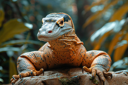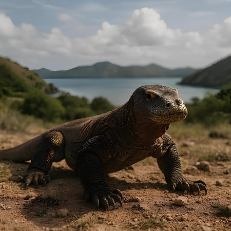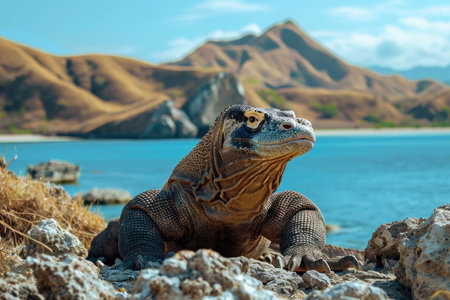 A majestic Komodo dragon basks in the sun, its powerful physique and ancient gaze captivating The lush wilderness unfolds behind, with towering mountains silhouetted against a clear blue sky The dragon's natural habitat, a paradise of vibrant life, stretches before it on a breathtakingly beautiful day AI Generative