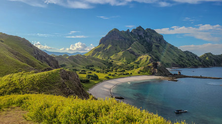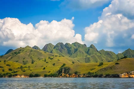 Green rugged mountain coastal landscape of the Komodo island, Indonesia, Asia