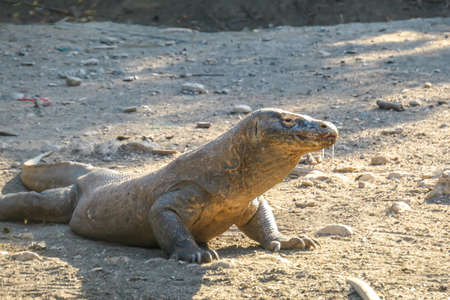 A gigantic, venomous Komodo Dragon roaming free in Komodo National Park, Flores, Indonesia. The dragon is resting in the sun. Toxic saliva is leaking from its mouth. Dangerous animal.