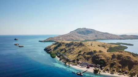 Lone standing island. Aerial drone shot. Komodo. Breathtaking panoramic view one of the amazing islands of the Komodo National Park surrounded by the Pacific ocean. Blue cloudy sky background.